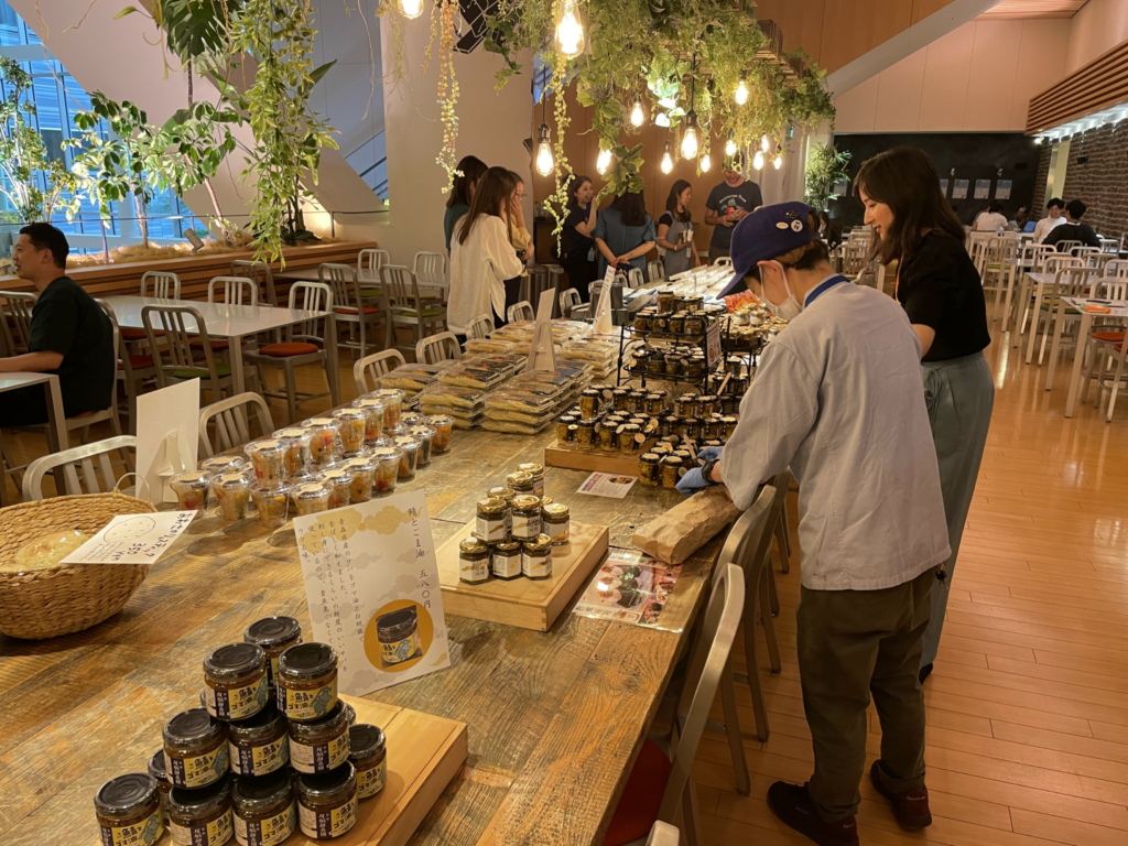 中央に設置されたテーブルには宮城県産や青森県産の水産品など、様々な商品がきれいに配置され、来た方全員が多くの商品を手に取ってお買い物を楽しんでいました。各所に設置された三陸常磐ものネットワークのポスターやチラシを目にして立ち寄る人や、「楽しそうだから来てみた」「身内が常磐地域に住んでいるから来てみた」といったように仕事帰りに立ち寄る人で開催時間中賑わっていました。