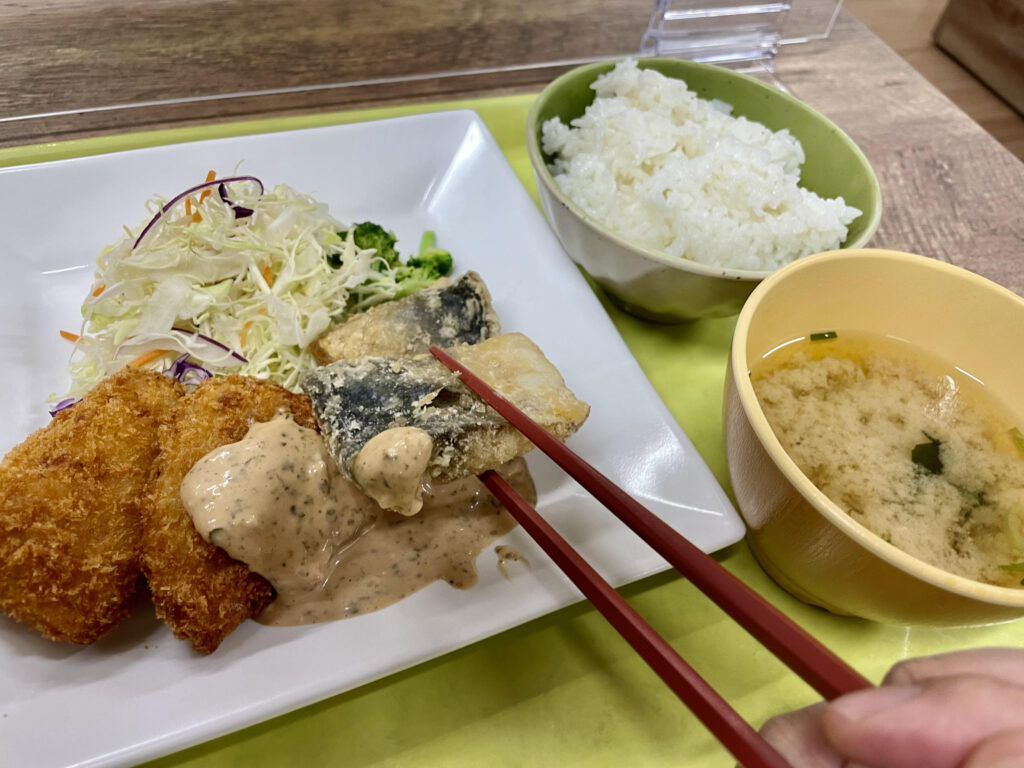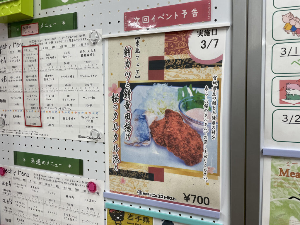 2023年3月は、東北フェアと題し、宮城県産の鮪カツと三陸産の鯖竜田揚げを提供。