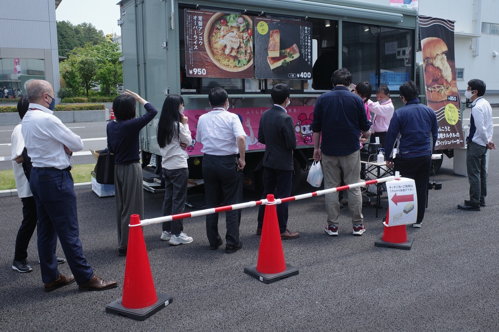 また、神奈川県鎌倉市にある情報技術総合研究所では、5月11日(木)に開催した従業員向けのイベントの“目玉”企画として三陸・常磐ものキッチンカーをお出迎え。お品書きを見るだけで思わずヨダレが出てきそうな絶品メニューを求め、こちらも行列ができる活況で、あっという間に185食が完売となりました。当社従業員が青空の下、復興支援の想いを胸に、高級素材ならではの美味に舌鼓を打つ心地よいひとときとなりました。