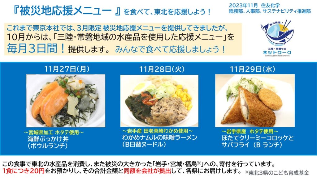 東京本社の社員食堂運営委託先である株式会社レパスト(東京都港区)と連携し、三陸・常磐地域で水揚げされた魚や海藻、生産された野菜などを調理した「応援メニュー」を3日間提供し、11月も3日間食事を提供いたしました。この食事メニューは、1食につき20円を利用者が負担し、同額を当社が上乗せし、東北3県(岩手・宮城・福島)の「こども育成基金」へお届けします。「お弁当」も月2回の販売をいたしました。