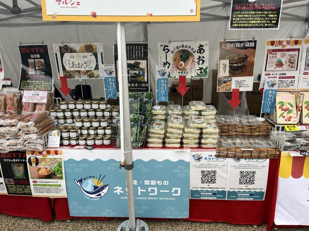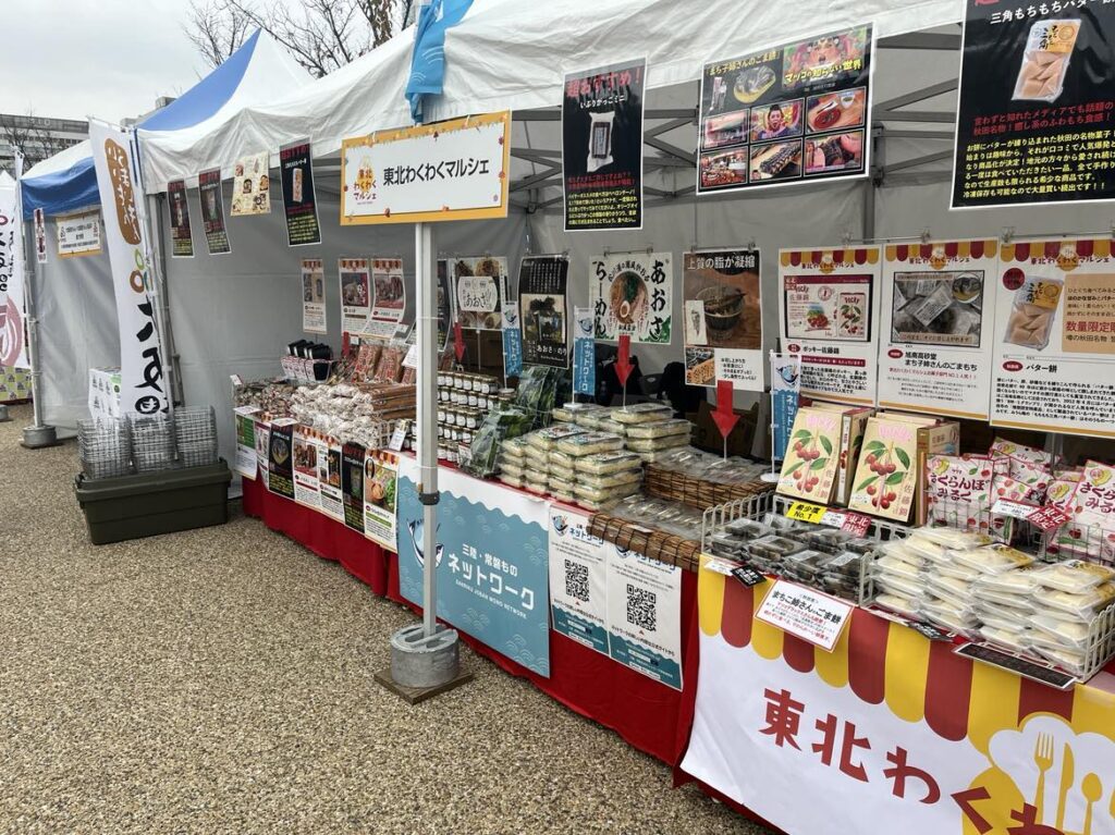 イベントでは、大阪産(もん)の物販や飲食、万博PR企画の他に、福島県産水産物の応援企画として株式会社東北わくわくマルシェと連携し、東北6県のB級グルメ、隠れた絶品などを販売するマルシェを開催しました。また、ステージでは福島県産品のPRやプレゼント企画も実施しました。