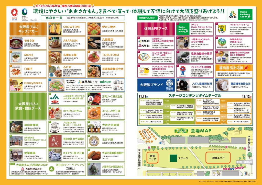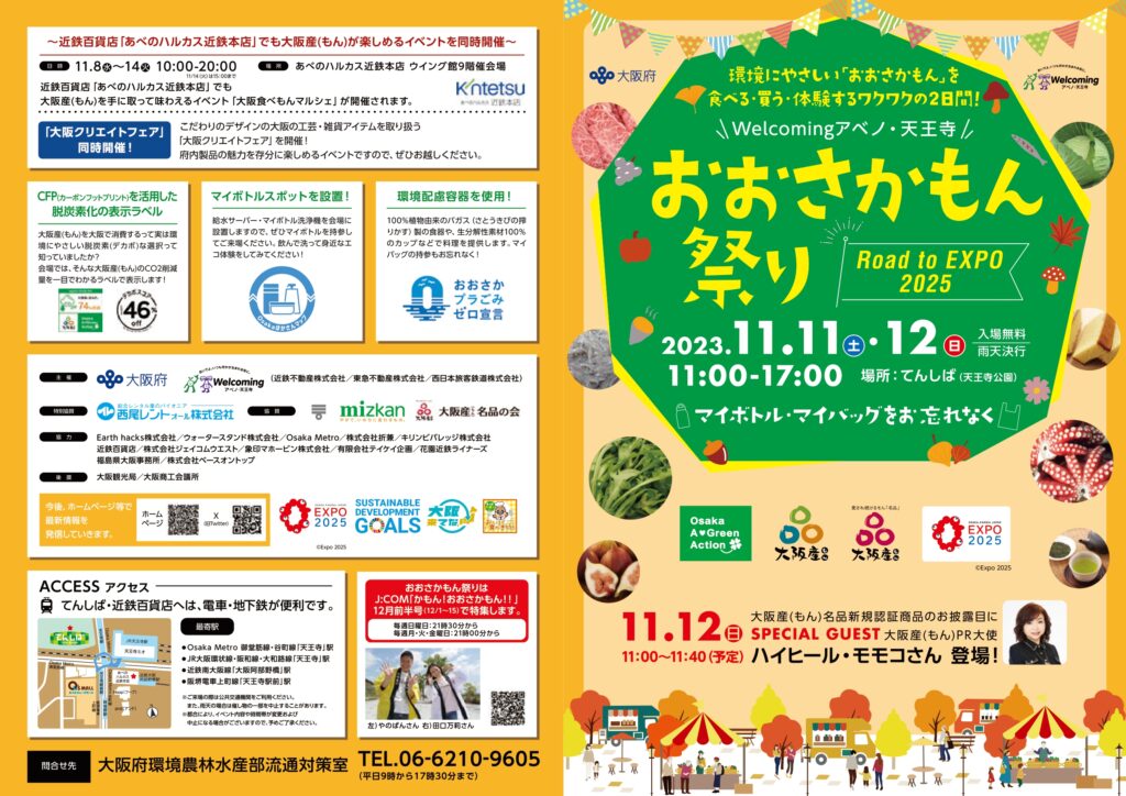 大阪府は、環境にやさしい大阪産(もん)を楽しむイベント「Welcomingアベノ・天王寺おおさかもん祭り Road to EXPO2025」を2023年11月11日(土曜日)から11月12日(日曜日)に、天王寺公園エントランスエリア「てんしば」にて開催しました。