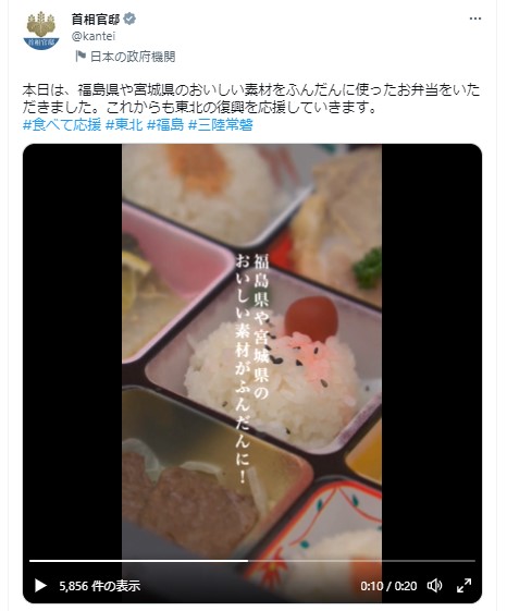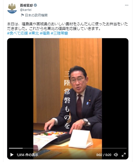 本日は、岸田内閣総理大臣が『極旨ふくしま弁当デラックス幕の内弁当』を召し上がりました。Twitterにて岸田総理のメッセージ動画が投稿されています。是非ご覧ください。