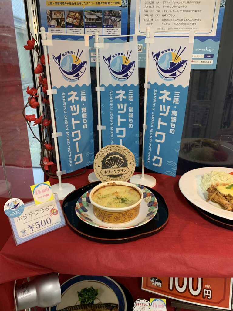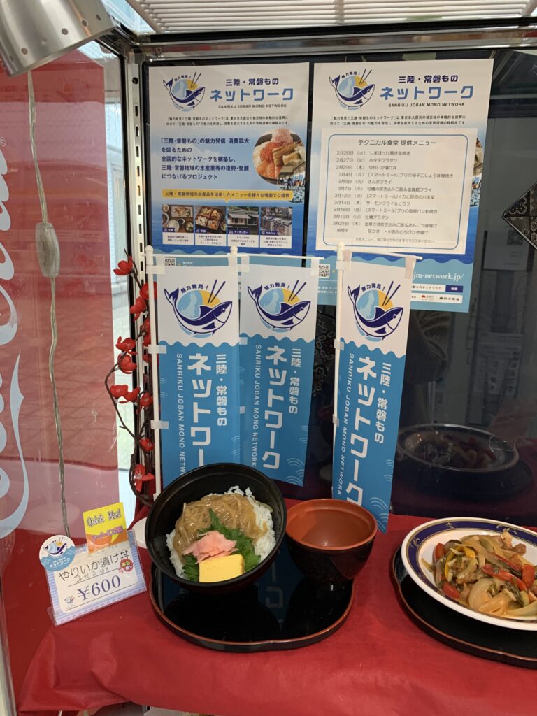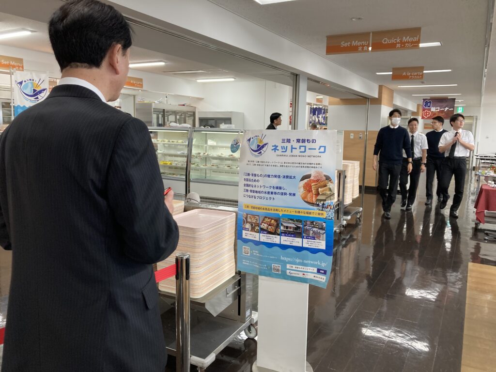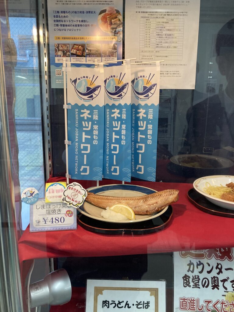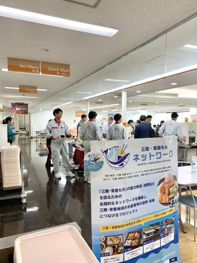 JALグループは、常磐ものの商流拡大のため「三陸・常磐ものネットワーク」の取り組みに参画しています。このたびJAL生活協同組合(JALOP)が運営する羽田地区と成田地区の社員食堂(4箇所)で「三陸・常磐地域の水産品を活用したメニューの提供」を2月20日(火)~3月21日(木)の期間、日替わりで実施しています。社員食堂には、三陸・常磐ものネットワークのチラシやポップ、のぼりを設置し、2月13日(火)には、JALグループポータルサイト(社内イントラネット)で「三陸・常磐地域水産品を活用したメニューの提供」についてを事前告知したこともあり、社員に大変好評で、社員食堂の営業が始まると日替わりメニューを楽しみにしている社員が大勢駈けつけ、毎回完売し、大繁盛の状況が続いております。