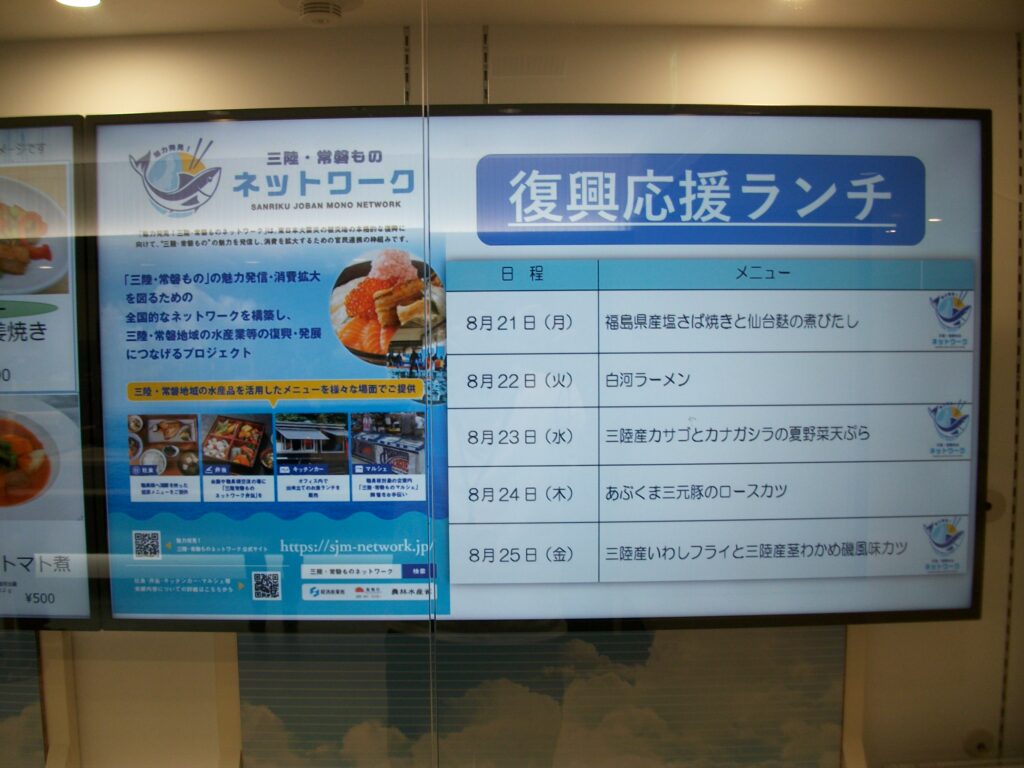 東京都は、東日本大震災で甚大な被害を受けた岩手県、宮城県、福島県の復興を支援しています。この度、食堂業務委託先のコンパスグループ・ジャパン(株)及びエームサービス(株)の協力をいただき、8月21日から8月25日まで、三陸・常磐地域の水産物も使用した「復興応援ランチ」を提供しました。東京都職員のみならず都民の方にも大変好評で、5日間で1,827食を販売しました。好評を受け、8月25日以降も引き続き、「三陸・常磐もの」の食材を職員食堂のメニューに取り入れることとし、現在も実施しております!