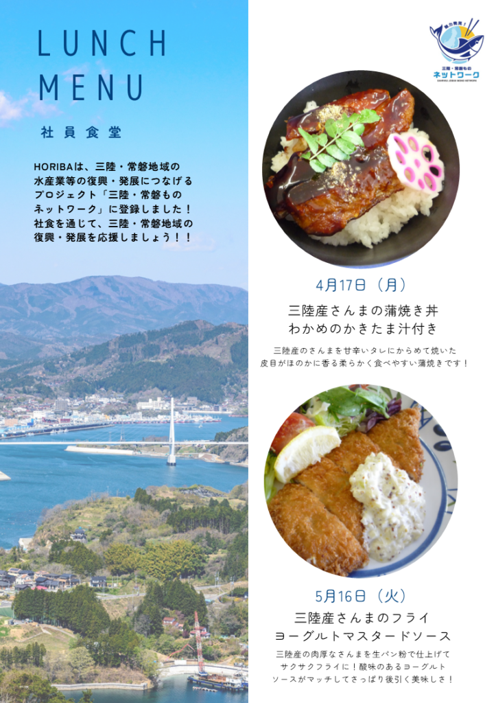 株式会社堀場製作所(HORIBAグループ)は、「魅力発見!三陸・常磐ものネットワーク」プロジェクトの趣旨に賛同し、グループ3拠点の社員食堂において、食堂運営委託会社の株式会社典座(てんぞ)と連携し、4月17日、5月16日に三陸・常磐もの水産物を使用したメニューを提供しました。今後も、月に一度、三陸・常磐ものをメニューに取り入れ、食を通じて「三陸・常磐もの」の魅力を発信し、消費拡大を推進します。