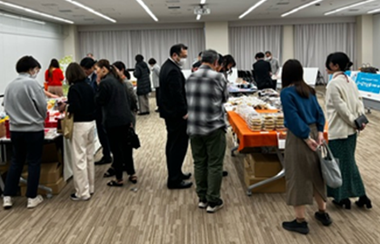 三陸常磐ものからは水産加工品やレトルト食品、青森からはりんごのお菓子やお酒など、様々な商品が提供され、職場の仲間とお互いのお気に入り商品について情報交換をする人の輪があちらこちらで出来上がっていました。