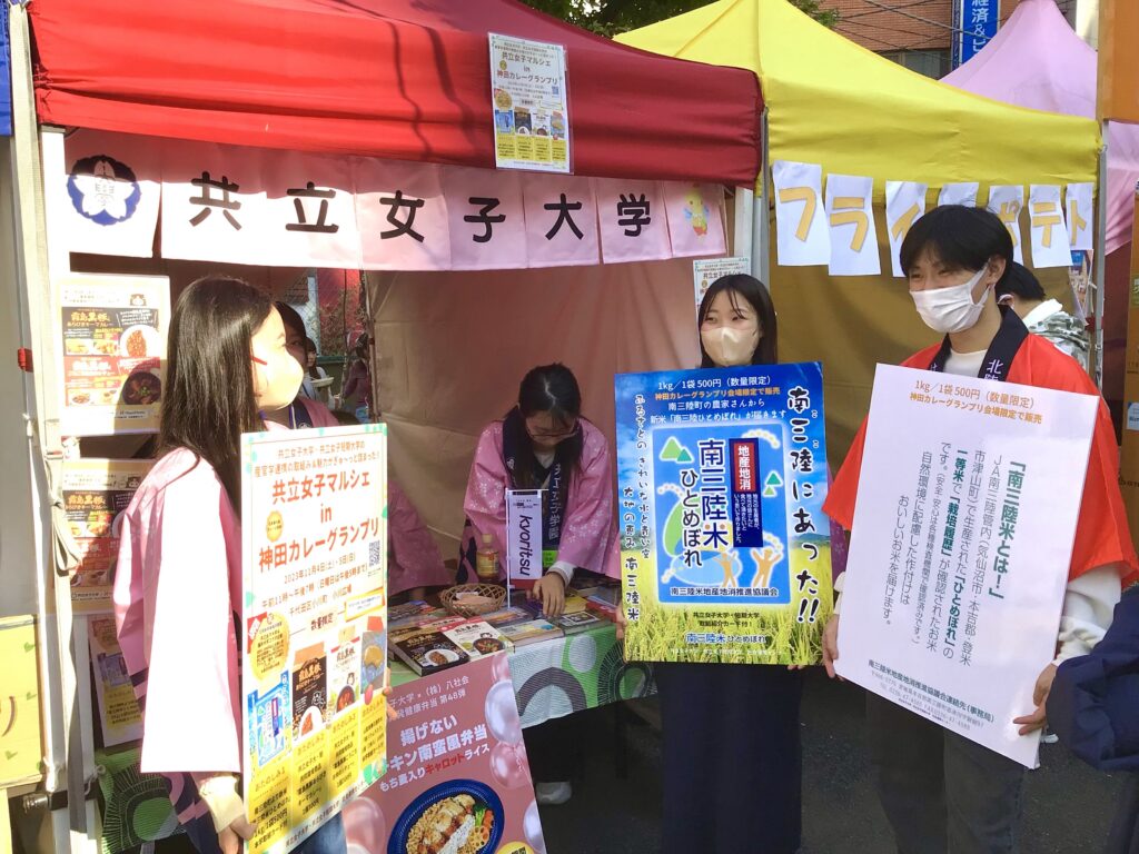 季節外れの暖かな日差しのもと実施となり、2日間でおよそ38,000人のカレーファンが来場し、思い思いに神田のさまざまなカレーを食べ比べなど盛り上がる中、本学の社会連携センターブースでは、「共立女子マルシェ」として、共立女子大学の共同開発レトルト商品「霧島黒豚あらびきキーマカレー」「霧島黒豚ごろごろお肉のシチュー」の他、連携協定締結をしている南三陸町のお米「南三陸米ひとめぼれ」を販売。本学の教養教育科目「自己開発」南三陸町フィールドワークに参加し、南三陸町にも訪問し震災後の復興、地域活性化へ向けて取組みを行っている学生たちより紹介し、2日間ともお昼には用意した「南三陸米ひとめぼれ」が完売しました。2日間の販売による売り上げ全額(仕入価格、運搬費を除いた全額)を、日本赤十字社へ寄付しました。