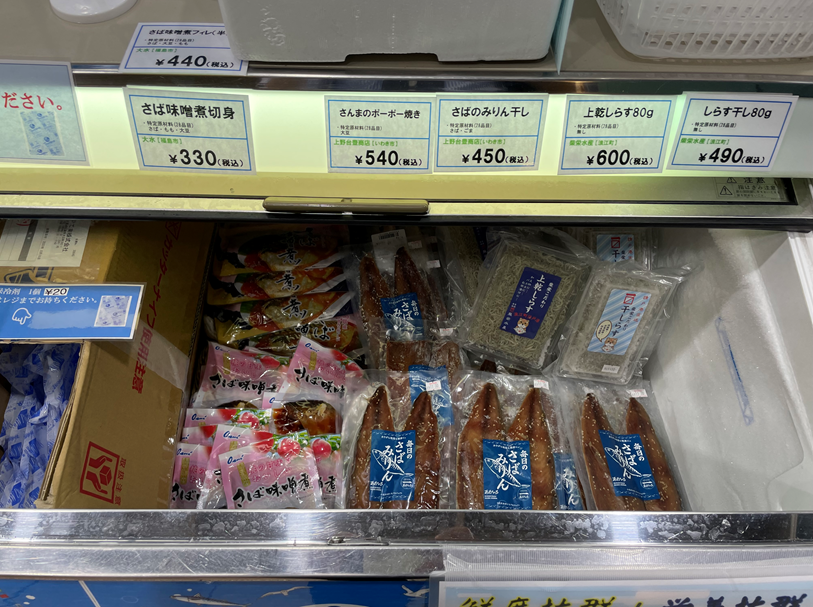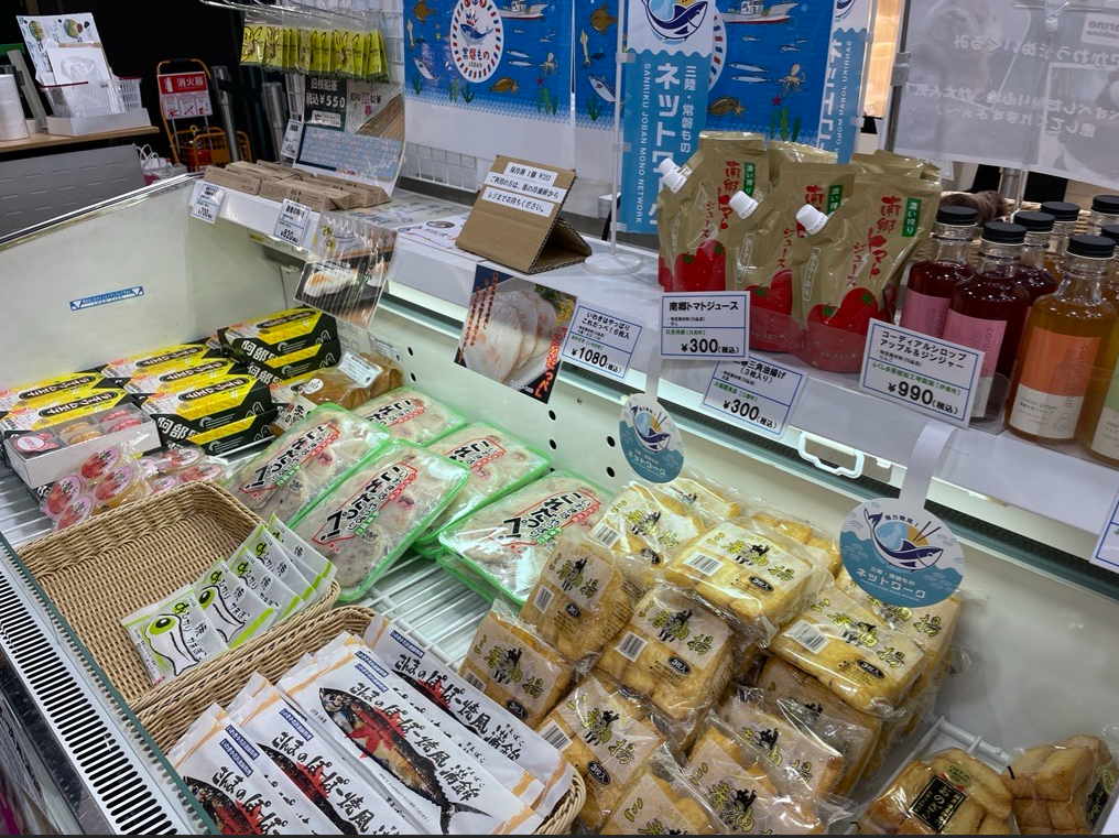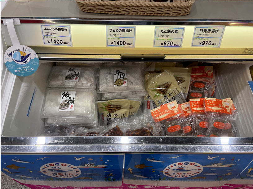 商品は果物から加工品まで様々なものが並び、平日夕方には帰宅途中のお客様で大変賑わっていました。冷蔵ケースには当ネットワークのミニのぼりが設置され、中には「あんこうのから揚げ」「目光唐揚げ」「さんまのポーポー焼き」「さばのみりん干し」等人気の水産加工品が販売されていました。