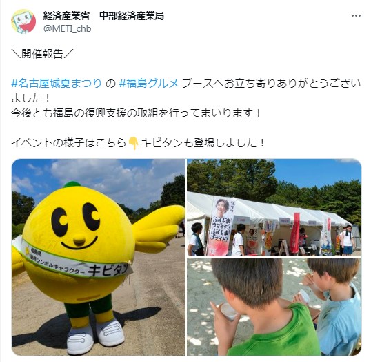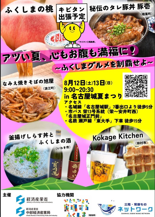 「三陸・常磐ウィークス(第2弾)」(2023年7月15日~9月30日)期間中、経済産業省でも三陸・常磐地域の水産物の消費拡大に取り組んでいます。8月12~13日は名古屋城夏祭りに出店、福島で熱意を持って復興に取り組む事業者様とともに、彼らの熱い想いと、その想いが詰まった魅力的な「食」の発信を行いました。