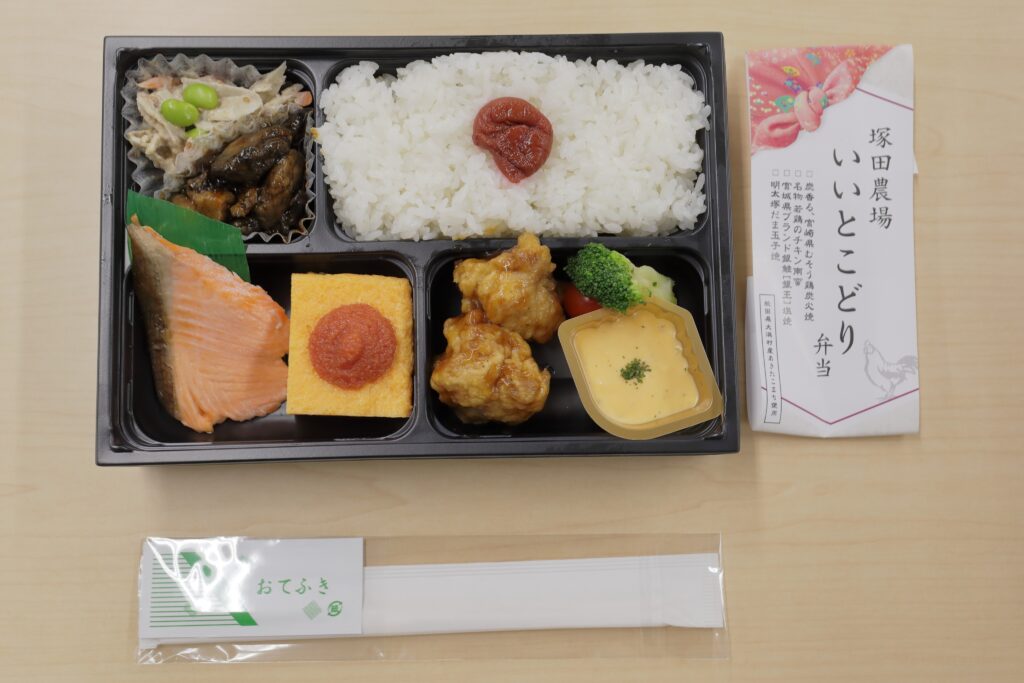 注文したのは、塚田農場おべんとうラボの「塚田農場いいとこどり幕の内弁当」で、若鶏のチキン南蛮や夢創鶏の炭火焼き、ブランド鮭「銀王」の塩焼きといったバラエティに富んだお弁当で参加者一同美味しくいただきました。