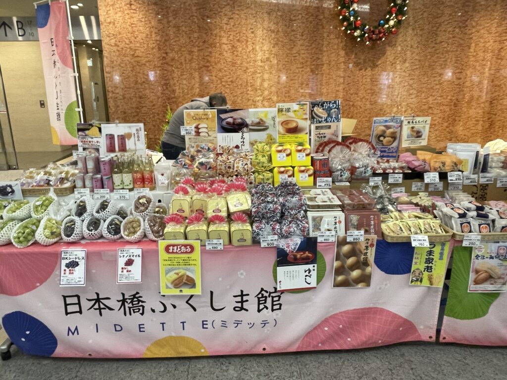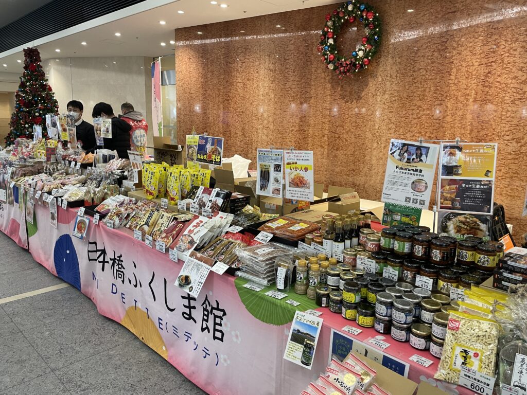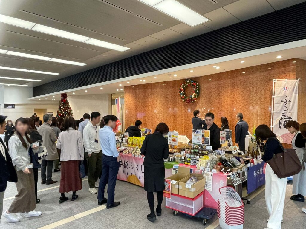 復興マルシェを開催するのは3回目です。今回は福島県のアンテナショップ「日本橋ふくしま館ミデッテ」様のご協力をいたただき、開催しました。郷土料理の「いかにんじん」や「あん肝のみそ漬け」、「松川浦かけるあおさ」といった水産品のほか、福島県の地酒、「ままどおる」や「いもくり佐太郎」といったお菓子などの名産品が並び、社員のほか、同ビルに勤務する皆様に大勢ご来場いただき、大変な盛況となりました。