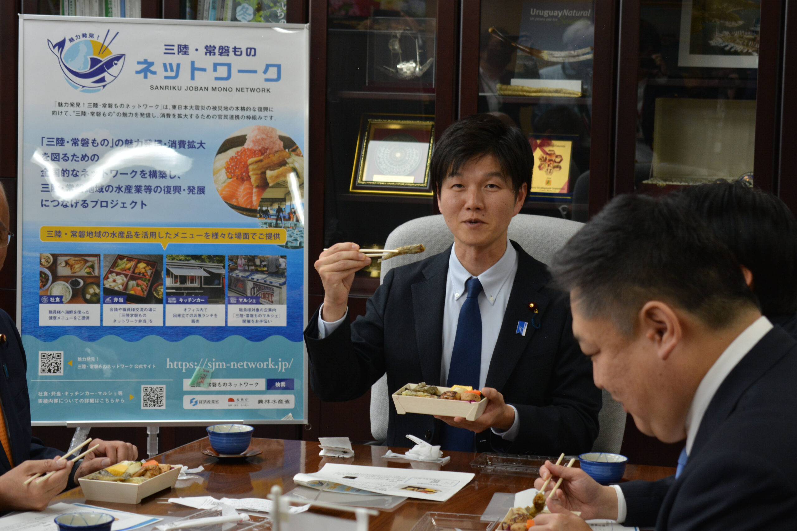 ネットワークに参画するお弁当事業者が、企業・団体向けにランチミーティングなどの会議や研修会、懇親会などで利用できるお弁当をお届けし、多くの参加企業・団体の社員・職員が、「三陸・常磐もの」を使ったお弁当を味わいました。ウィークス期間中は、脂ののったふっくらとしたアナゴを贅沢に使った「三陸産穴子重御前」や福島・小名浜の郷土料理であるサンマのポーポー焼きをのせたのり弁、肉と海鮮がコラボした「三陸わかめと特選牛肉のすき焼き弁当」などの期間限定弁当も販売。政府の省庁でも積極的に利用し、赤澤亮正・経済産業大臣や鈴木憲和・農林水産大臣もお弁当を堪能しました
