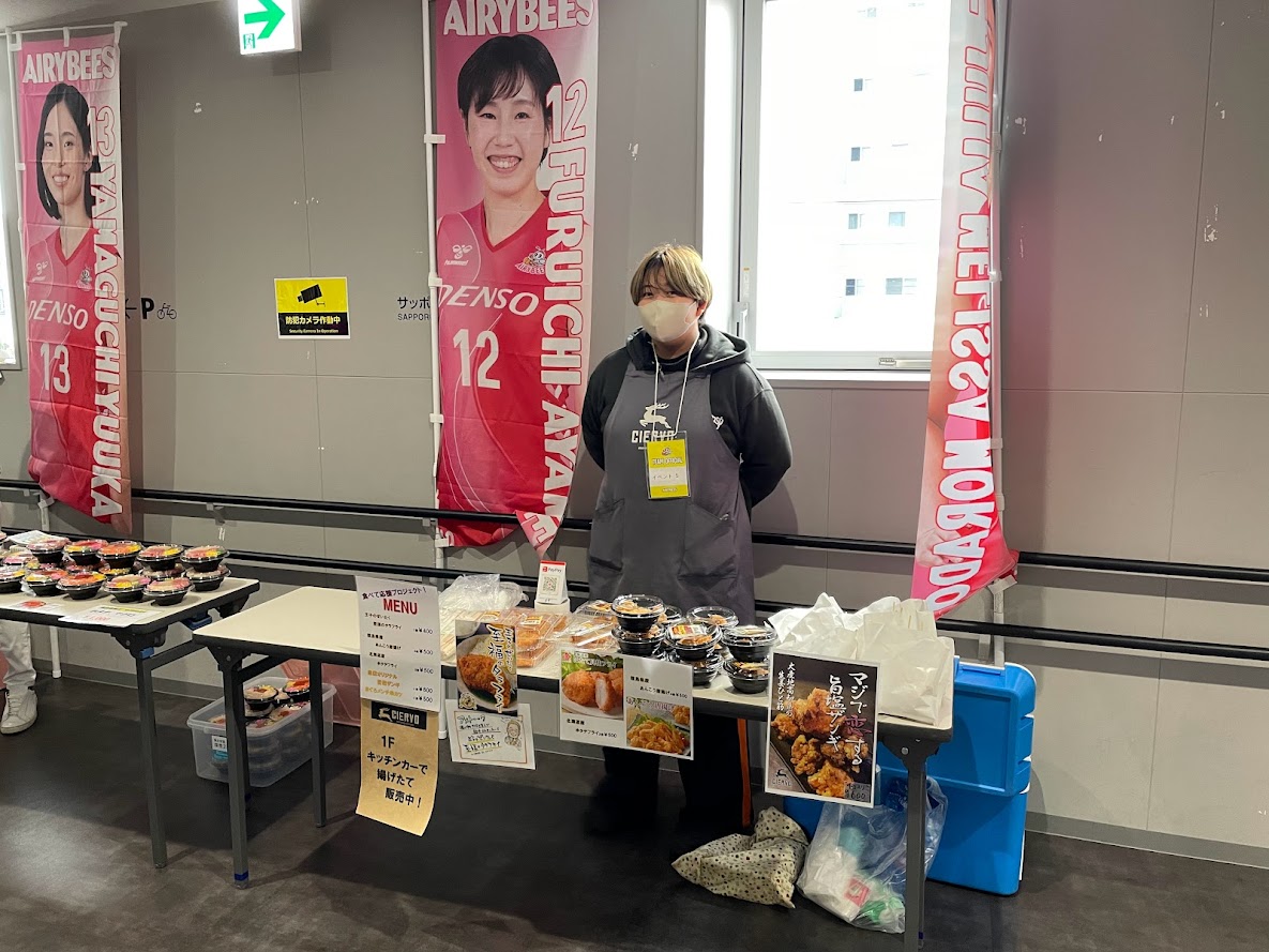 女子バレーボールチーム(V.LEAGUE V1リーグ)のDENSO AIRYBEES〈デンソーエアリービーズ〉(ホームタウン:愛知県西尾市・サブホームタウン:北海道札幌市・福島県郡山市)では、福島第一原発のALPS処理水放出に伴う禁輸措置などで流通が低迷している北海道産ほたてや、福島県沖の海産物の消費促進を目的としたキッチンカーによる食のイベントを、札幌で開催されるV.LEAGUEの開催に合わせて、23年11月25日(土)・26日(日)の2日間で開催しました。