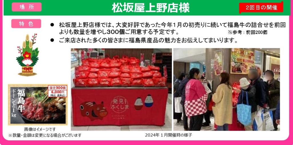 東京電力グループが取り組む「発見!ふくしま」は、松坂屋上野店様にて、大変好評であった今年1月の初売りに続いて福島牛の詰合せを前回よりも数量を増やし300個ご用意する予定です。 ※参考: 前回200個