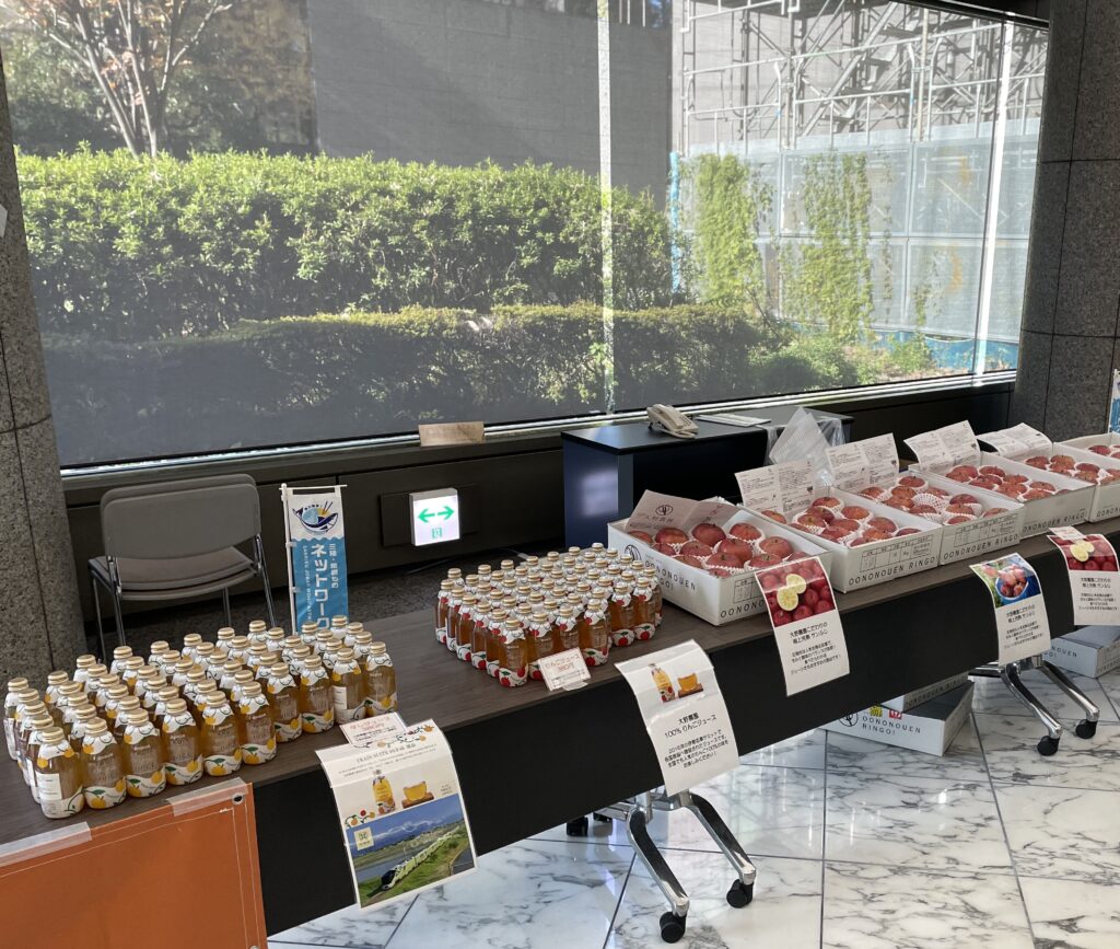 開催にあたっては、マルシェ事業者の一般社団法人東の食の会様に協力いただき、三陸・福島県産の水産加工品、福島県産の旬のりんごなどを販売しました。