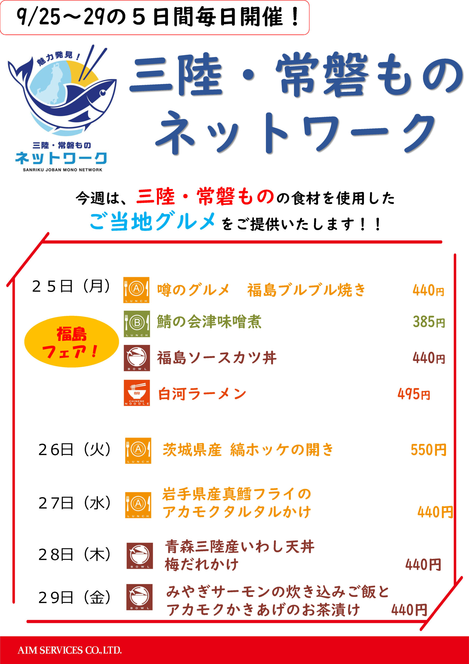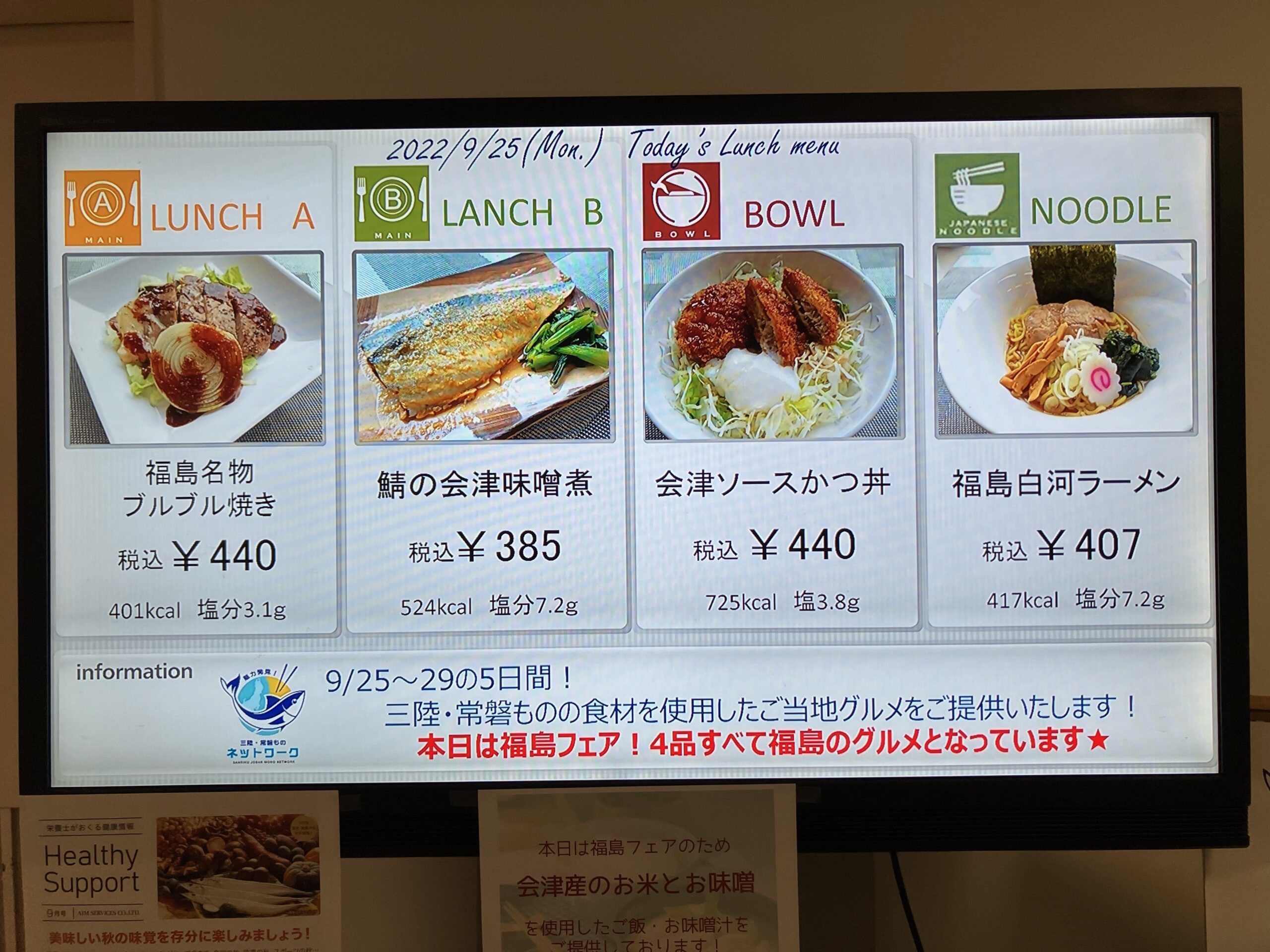 - 社員食堂での三陸・常磐ものメニューの提供:令和5年9月25日~令和5年9月29日