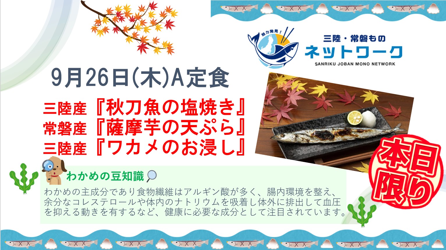 三陸産の秋刀魚、三陸産のわかめ、常磐ものの薩摩芋を使用した定食は完売いたしました♪