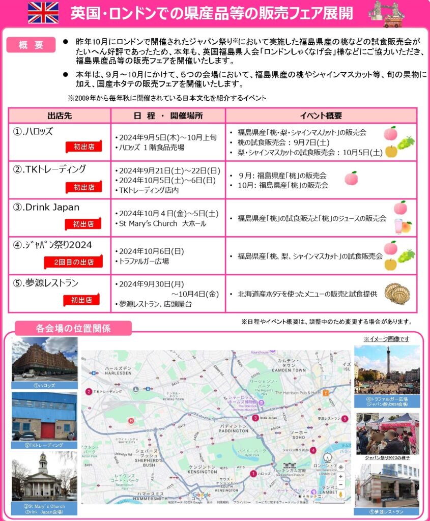 東京電力グループが取り組む「発見!ふくしま」は、昨年10月にロンドンで開催されたジャパン祭り※において実施した福島県産の桃などの試食販売会がたいへん好評であったため、本年も、英国福島県人会「ロンドンしゃくなげ会」様などにご協力いただき、福島県産品等の販売フェアを開催いたします。