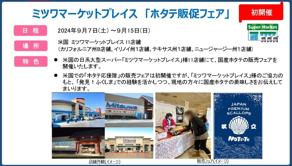 米国での「ホタテ応援隊」の販売フェアは初開催ですが、「ミツワマーケットプレイス」様のご協力のもと、 「発見!ふくしま」での経験を活かしつつ、現地の方々に国産ホタテの美味しさをお伝えしてまいります。