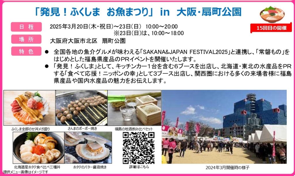 「発見!ふくしま」として、キッチンカー1台を含む6ブースを出店し、北海道・東北の水産品をPRする「食べて応援!ニッポンの幸」として3ブース出店し、関西圏における多くの来場者様に福島県産品や国内水産品の魅力をお伝えします。