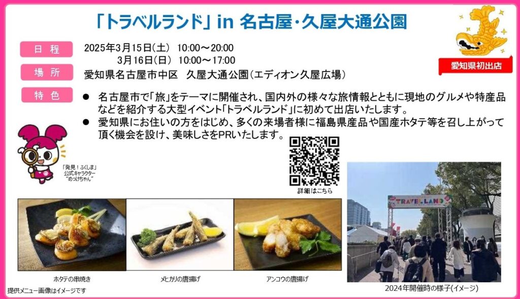 東京電力グループが取り組む「発見!ふくしま」は、名古屋市で「旅」をテーマに開催され、国内外の様々な旅情報とともに現地のグルメや特産品などを紹介する大型イベント「トラベルランド」に初めて出店いたします。