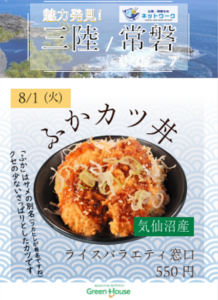 グリーンハウス様に運営を頂いております各製作所食堂では「ふかかつ丼」「ふかかつバーガー」を提供。「ふかかつって何?」「サメ肉なんですよ」といった社員と調理スタッフとの会話が交わされ、、東京以西に所在する当社社員を中心に、三陸・常磐の新しい食材を知ってもらえる機会になりました。 LEOC様に運営を頂いている本社カフェテリアでは「カツオカツ」を提供。「メンチカツみたい」とその意外な触感と味に驚いたといった感想が聞かれました。
