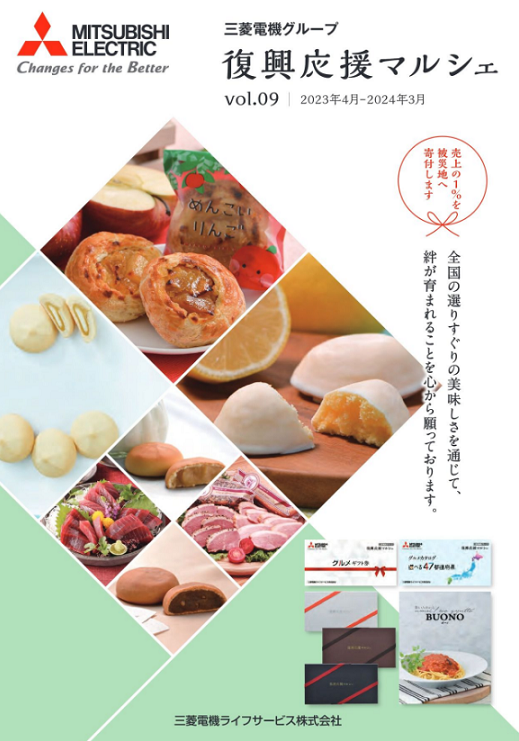 三菱電機グループでは「復興応援マルシェ」として、三陸・常磐地域をはじめとした全国各地の海の幸、大地の恵みなどを、特設サイトからオンラインで購入することができます。今年で9回目となり、毎年売上の1%を被災地へ寄付をしています。毎年多くの人が各地域の名産品を贈り物にしたり、自分で味わったりしながら、復興を応援する思いを育んでいます。