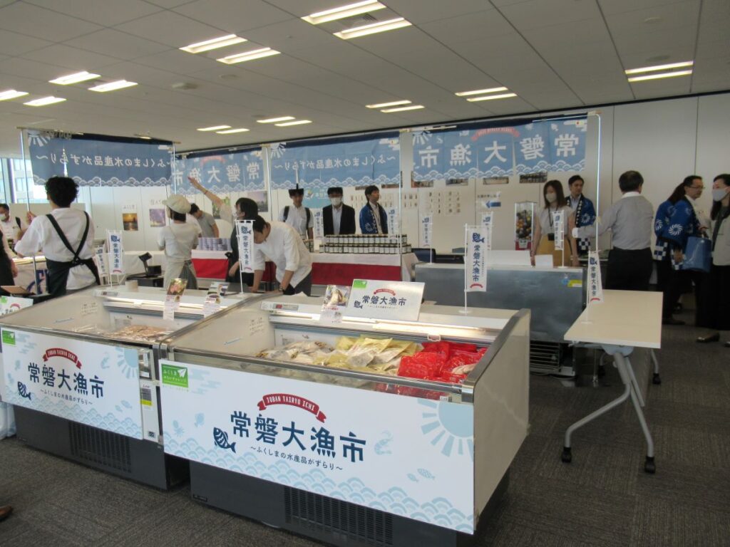 2023年9月19日、本社にて「福島海産物マルシェ」を開催しました。今回はALPS処理水放出による風評被害払拭のため急遽開催を決定し、「福島県の海産物」に特化することとしました。また初めての試みとして、冷蔵・冷凍庫計7台を持ち込んで冷蔵・冷凍海産物の販売を実施しました。会場にはその他にも蒲鉾や海藻類が並び、豊富な福島の海産物を前にどれを選んだらよいか迷う来場者が多く見受けられました。なお今回は太平洋セメントグループとして支援したいと考え、在京グループ会社にも協力を呼びかけ売り上げを大きく伸ばすことができました。